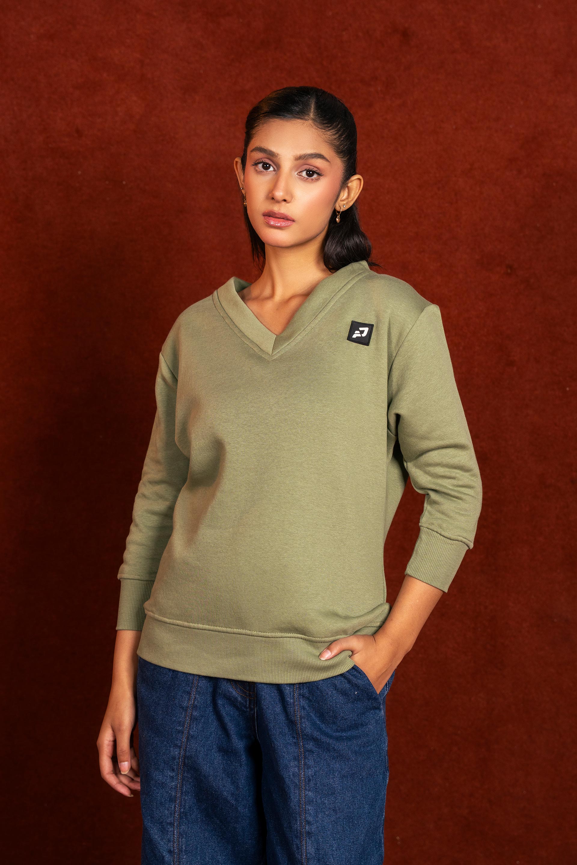 - Elevate your casual game with this striking sage green sweatshirt, designed with a bold V-neckline that commands attention.