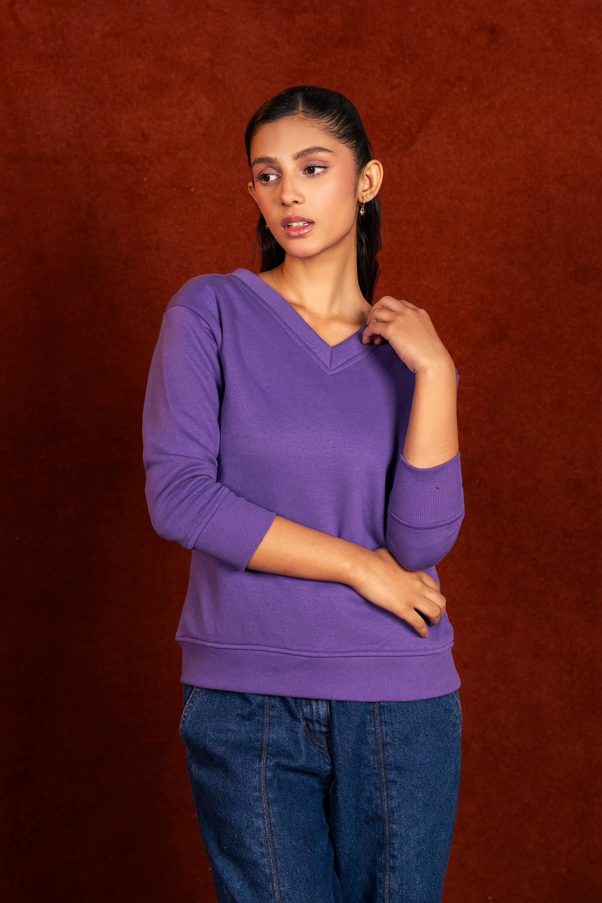 - Own your presence in this audacious purple V-neckline sweatshirt that refuses to whisper.
